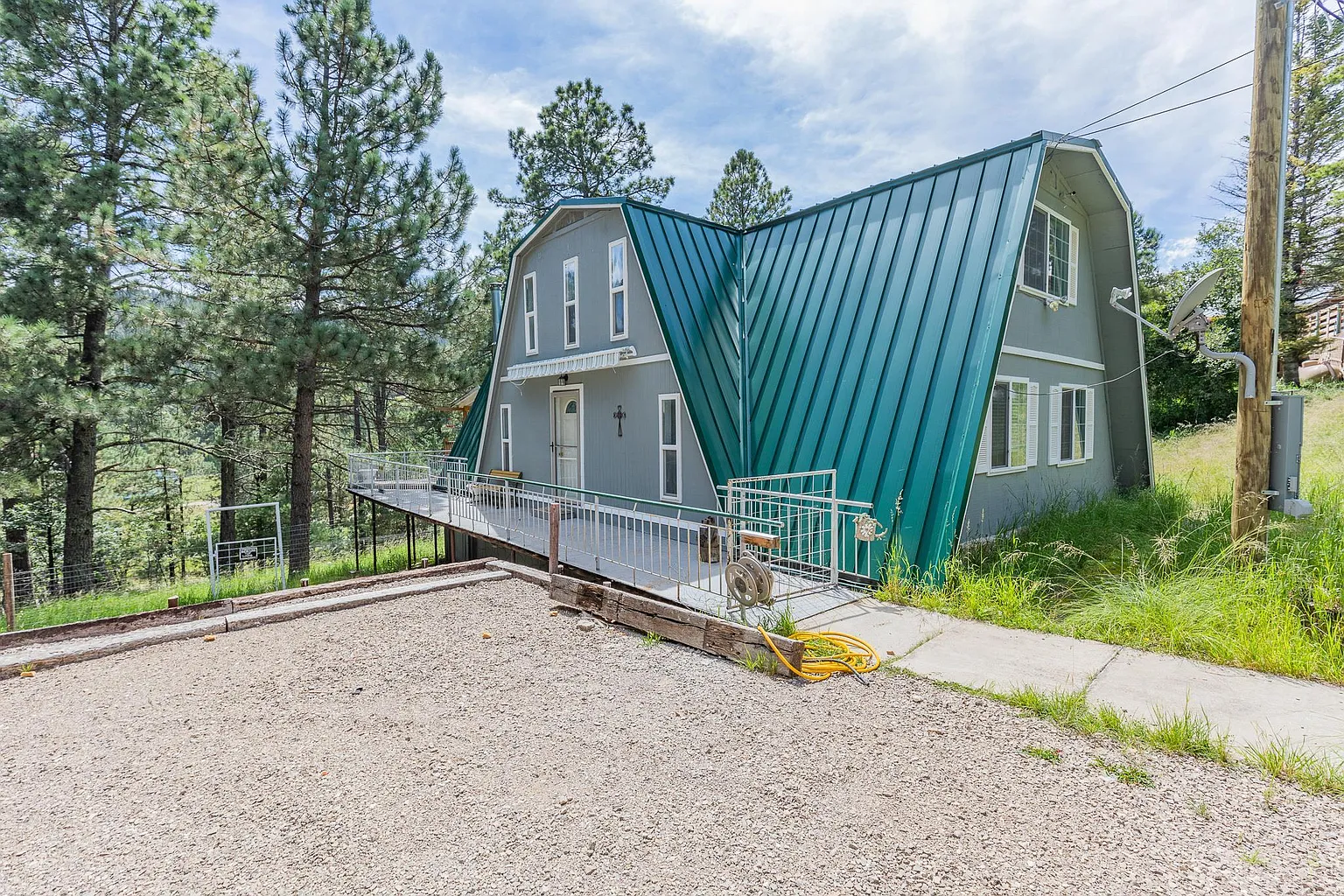 Come up to the mountains and enjoy the amazing mountain air and cooler temps? This Modified A-Frame has been recently remodeled with laminate wood flooring throughout, newer metal roof in the last few years, kitchen cabinets and counter tops. This home is the perfect get-a-way spot or long term living spot for you! Home features 3 Bedrooms and 2 Baths, single level entry to home's main floor, which features an open living room and dining area, kitchen, laundry area, bedroom and a bath. The second floor features the large primary bedroom with extra sitting space for those afternoon relaxation days or office space, a third bedroom and shared full bath. Come sit out on the large covered deck and enjoy those afternoon rains or let the sunshine down on you as you enjoy the canyon views! There is a pellet stove in the living room area for those chilly fall days and winter nights as you watch the tranquility of the falling snow. Schedule your viewing today and check out the 3D virtual tour Seller is offering Owner Financing with negotiable terms
